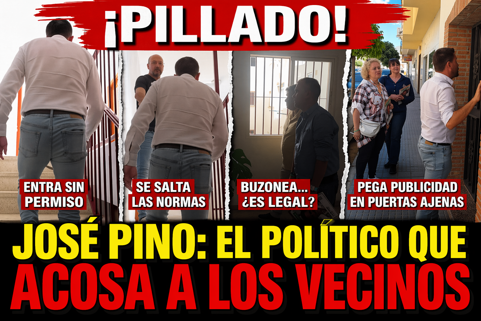 La pregunta, por tanto, es directa: ¿Quién ha autorizado a José Pino a entrar en comunidades ajenas para hacer propaganda? Porque si no existe ese permiso, la imagen que queda es demoledora: una política invasiva, molesta y cada vez más difícil de justificar. Y si además la publicidad acaba pegada en puertas o colocada en elementos no autorizados, el problema deja de ser solo de mal gusto para rozar de lleno la infracción administrativa.